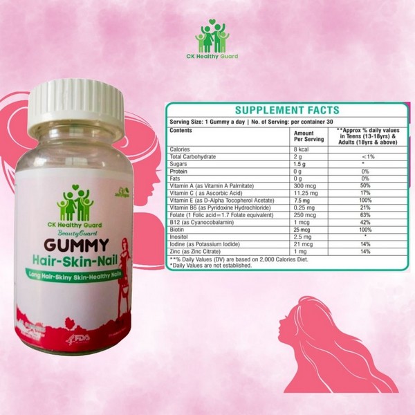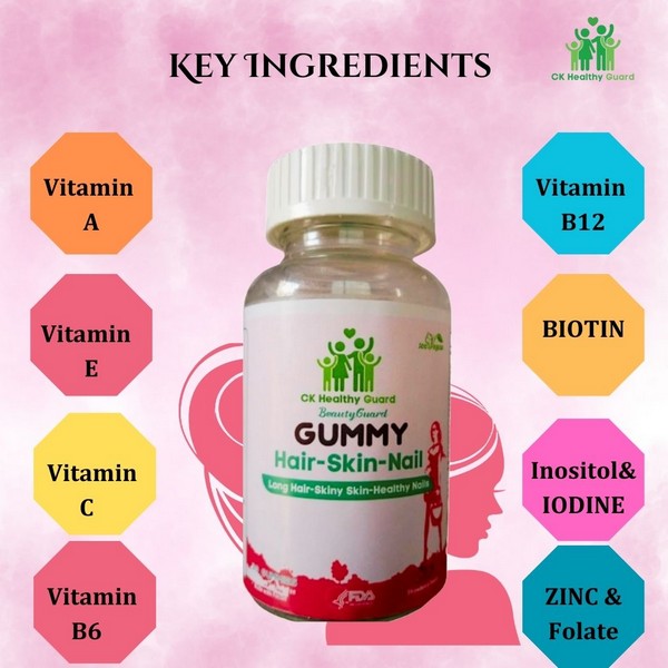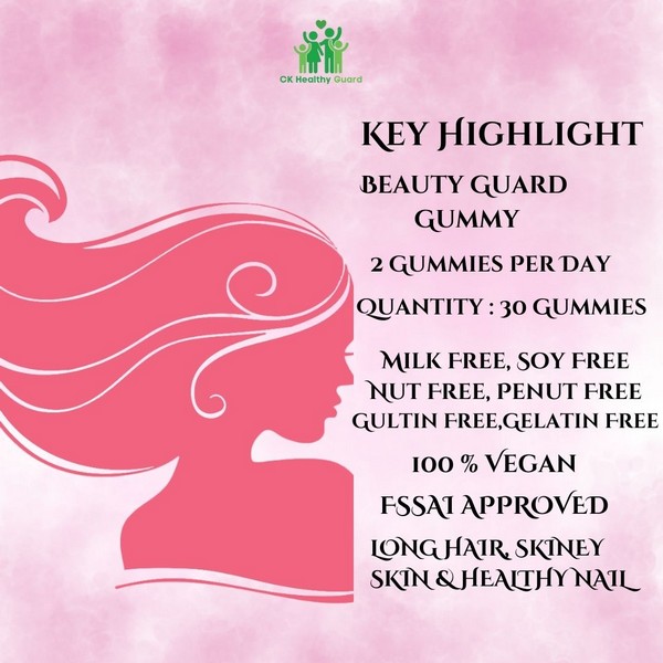 Beauty Guard Gummy is a combination of Vitamin A, C, E, B6, B12, Folic Acid, Biotin, Inositol, Iodine, & Zinc. It supports long hair, shiny Skin & Healthy Nails.